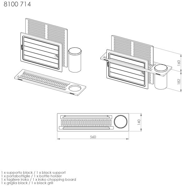 Black grid, Iroko-wood chopping board, stainless steel bottle holder