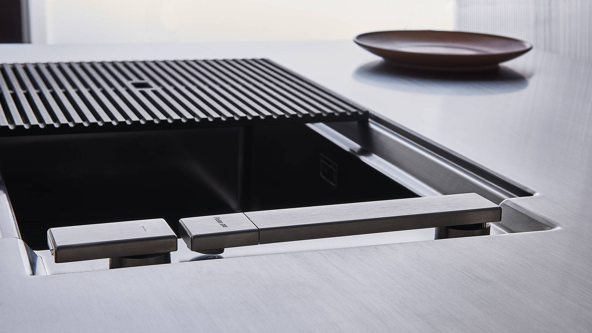 Foster's attention to detail, in this collection, is highlighted by the recessed area characteristic of both the sink and the hob.