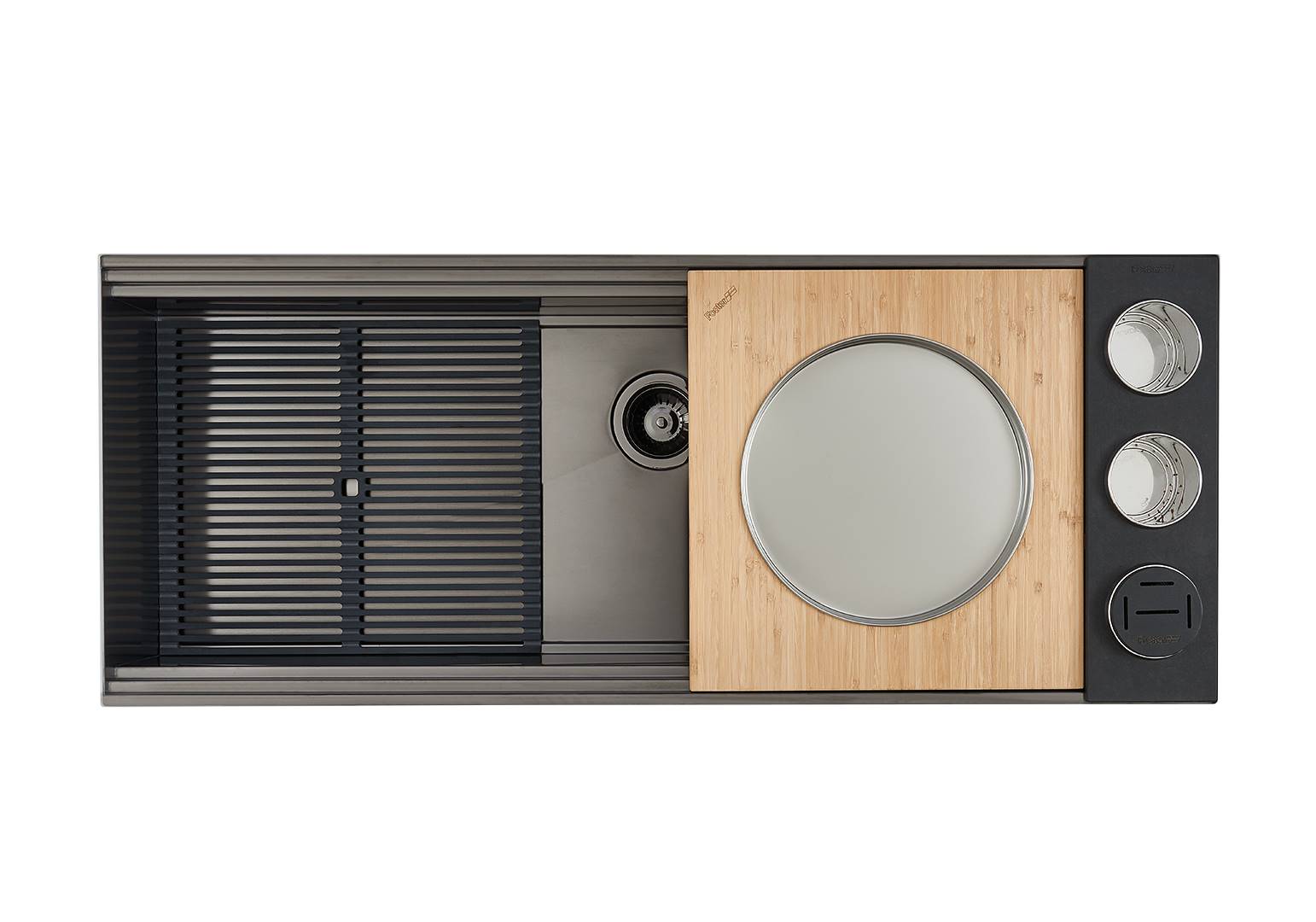 Triple recess - sliding accessoriesThe Foster Milano sink has an ingenious design that makes it simple to use a large set of optional accessories. On the topmost supporting step, the innovative Black grids slide, creating a large and practical surface to rinse food and crockery. The second step is meant to support and allow the... sliding of a complete combination of accessories, which make some operations practical and safe: rinse, drain, slice, grate… everything can be done inside the sink. The third supporting step is on the bottom of the bowl. On this step one can rest the Black grids, making it possible to rinse foodstuffs without their coming in contact with the bottom of the sink, which may be dirty.