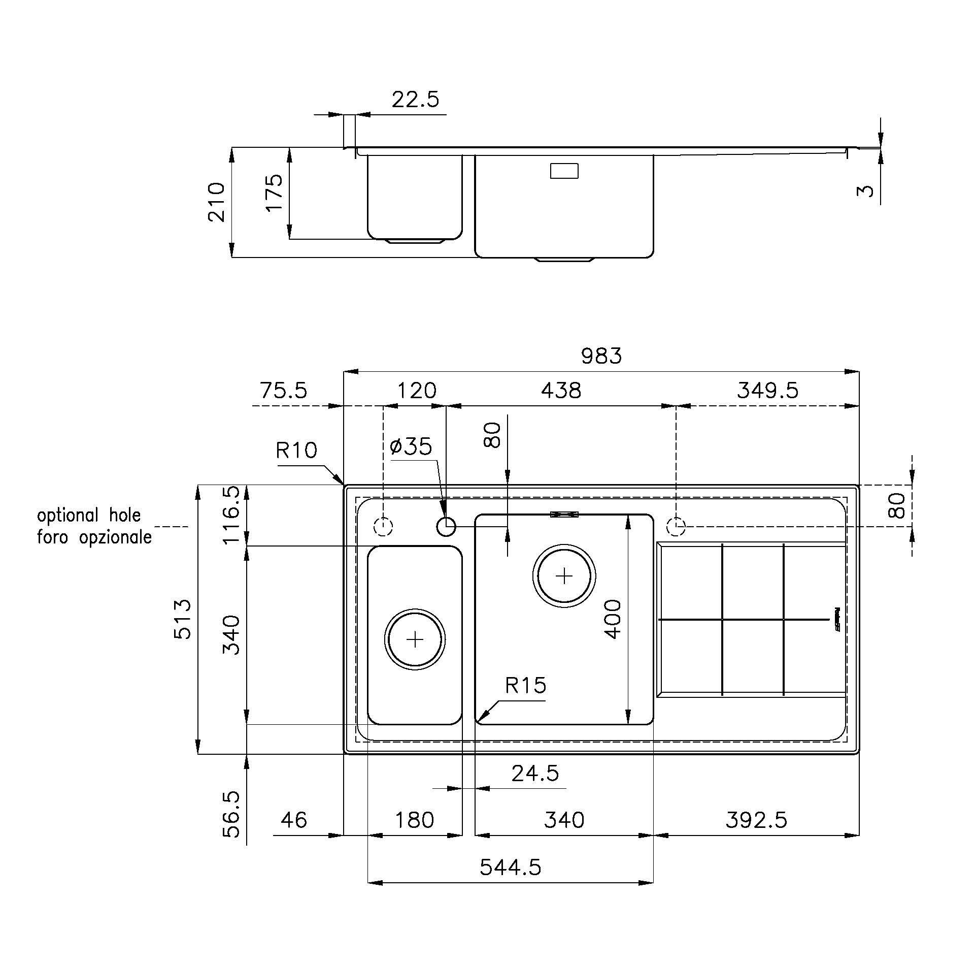 The sink can be customized with the execution on request of additional holes, usable for double-hole mixers, for remote controlled drains or for the installation of soap dispensers. The positions are marked on the drawings with dotted line holes.