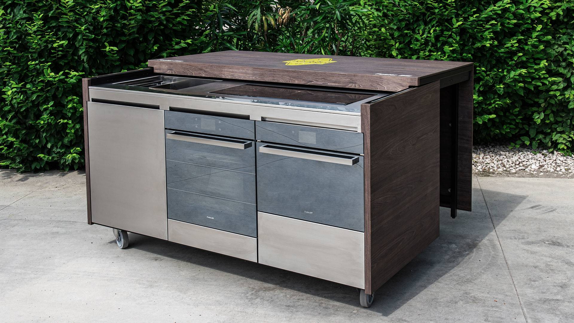 Foster InsiemeLa nueva cocina sobre ruedas está equipada con una tapa corredera lista para transformarse en una cómoda mesa, una vez que la cocina esté en funcionamiento.