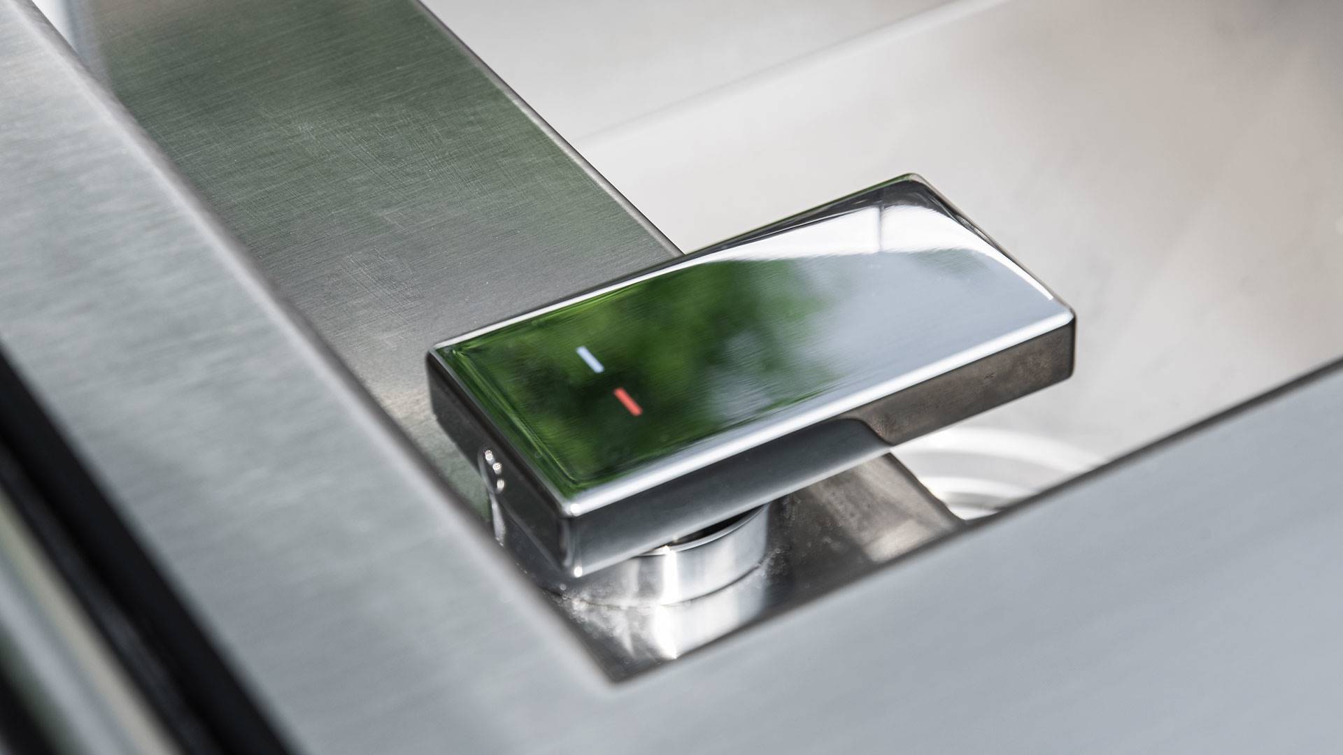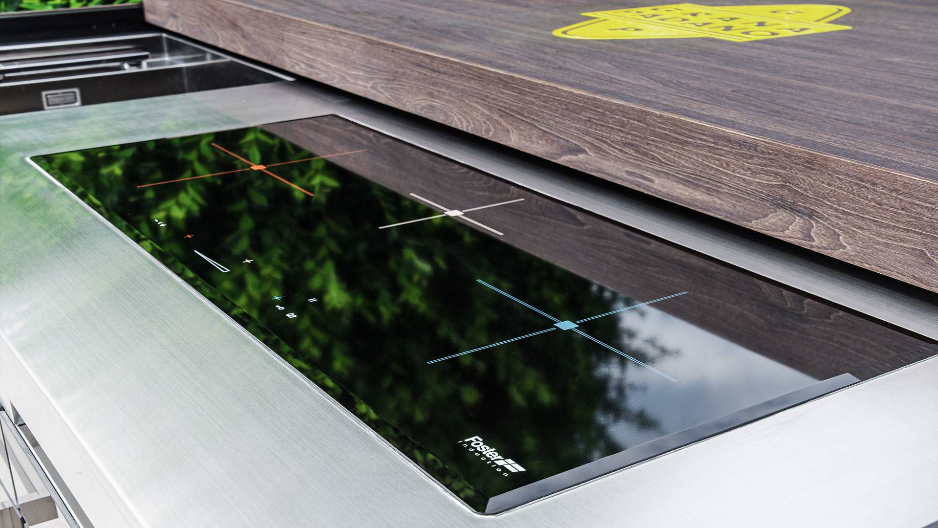 La tapa esconde una zona de lavado equipada con fregadero Quadra y batidora plegable Eclipse y una zona de cocción, para la que se eligió la placa de inducción de tres zonas S4000 Power Control.