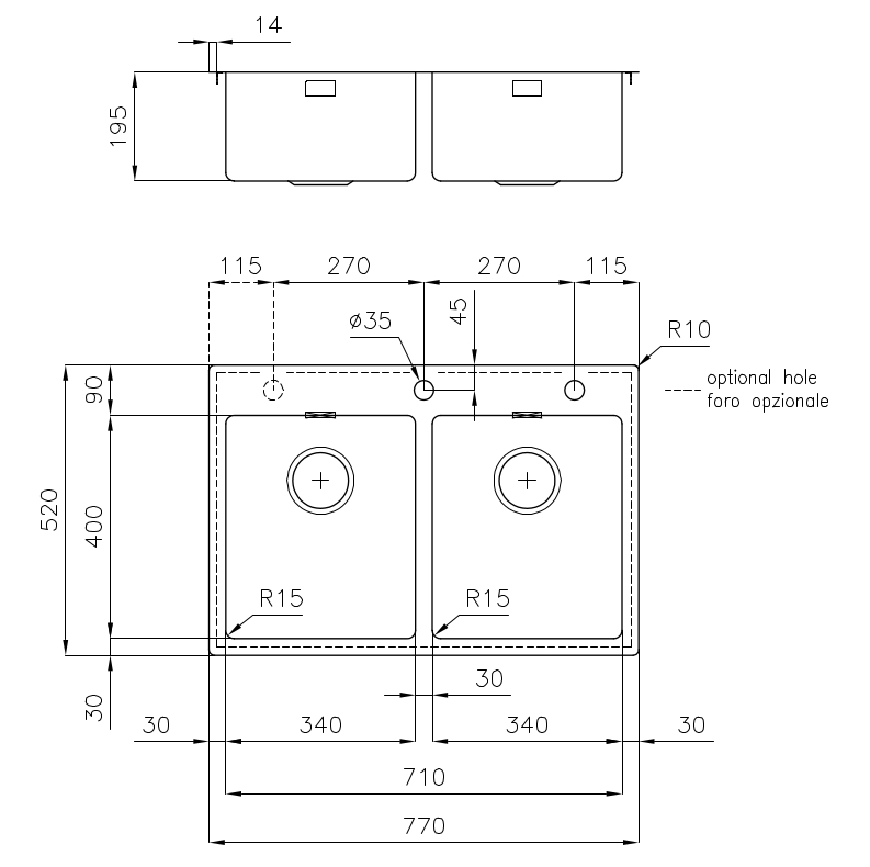 2 orificios de serie - 3° orificio bajo petición
