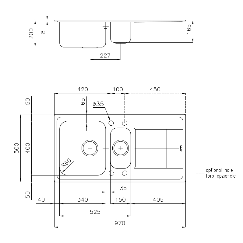 El fregadero se puede personalizar con la ejecución de orificios adicionales, especificados en fase de pedido, utilizables para monomandos de doble orificio, para desagües con mando a distancia o para la instalación de dispensadores para el jabón. Las posiciones se indican en los diseños con... orificios por una línea discontinua.