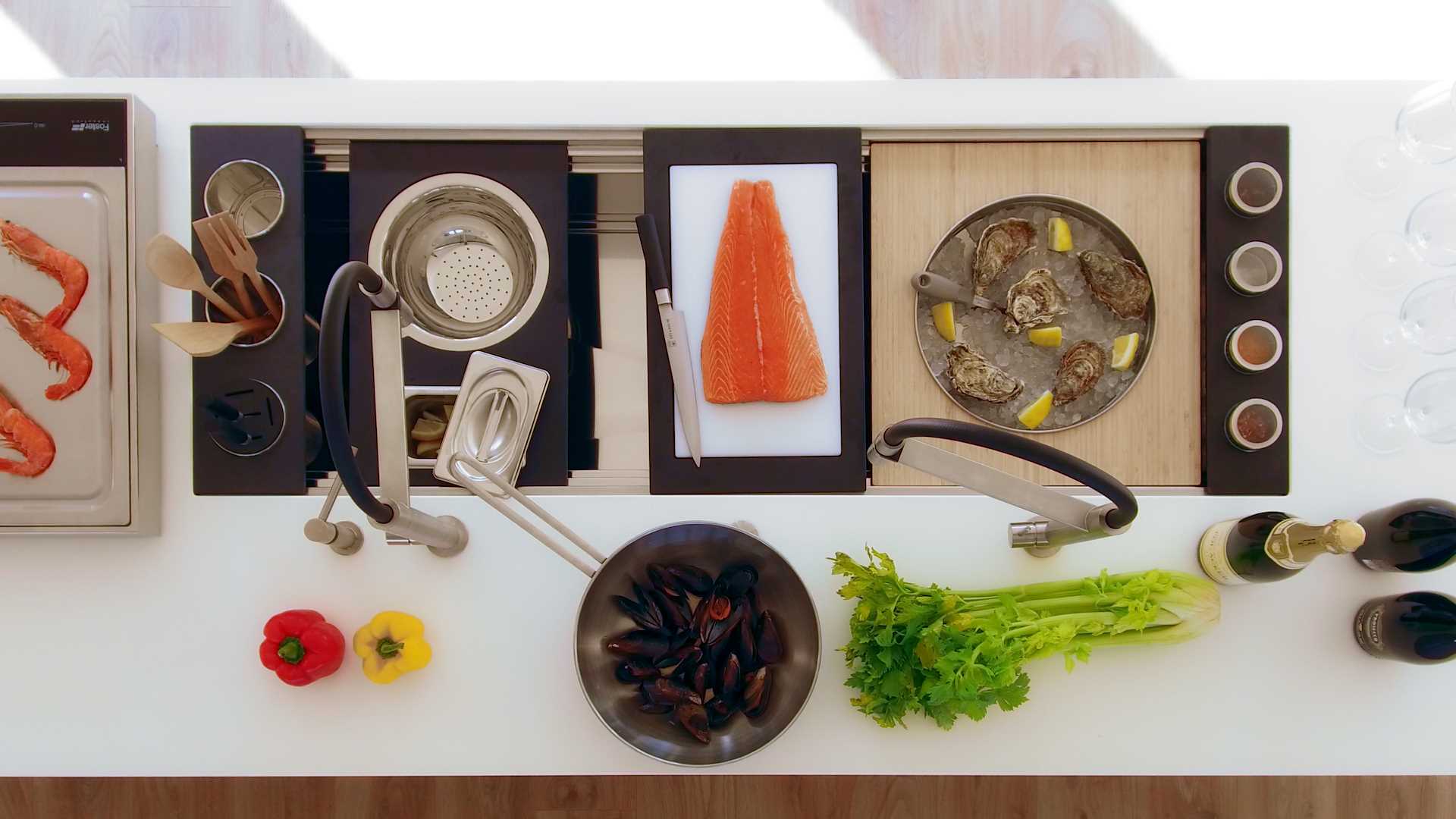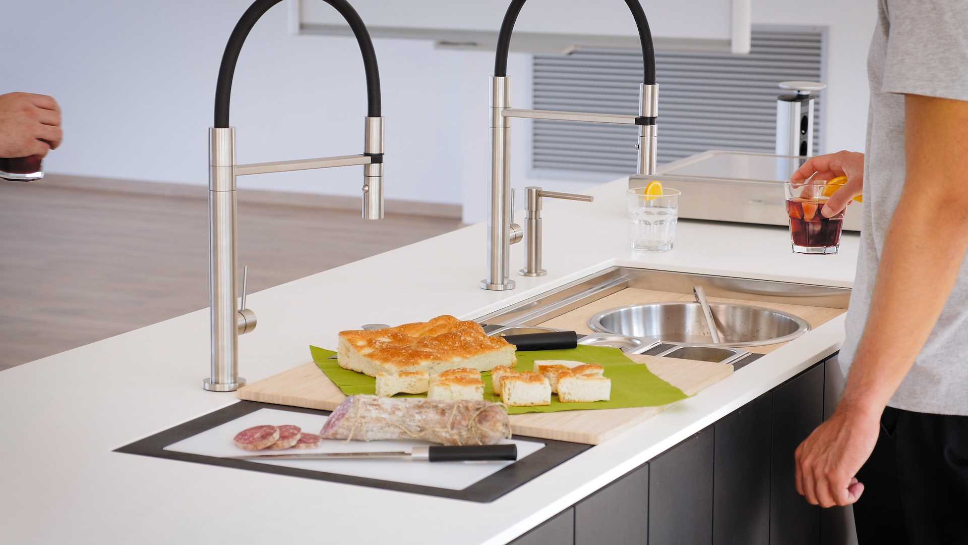 El centro funcional Happy Hour traslada la definición de fregadero a nuevos horizontes. Gracias a su amplia gama de complementos, es la auténtica estrella de la fiesta, de tus aperitivos, de tus buffets, además de ser una práctica y completa estación de chef, capaz de desaparecer para luego aparecer en su zona de lavado totalmente equipada. Happy Hour está equipado en su configuración básica con la tabla de cortar de bambú y la práctica y funcional rejilla negra