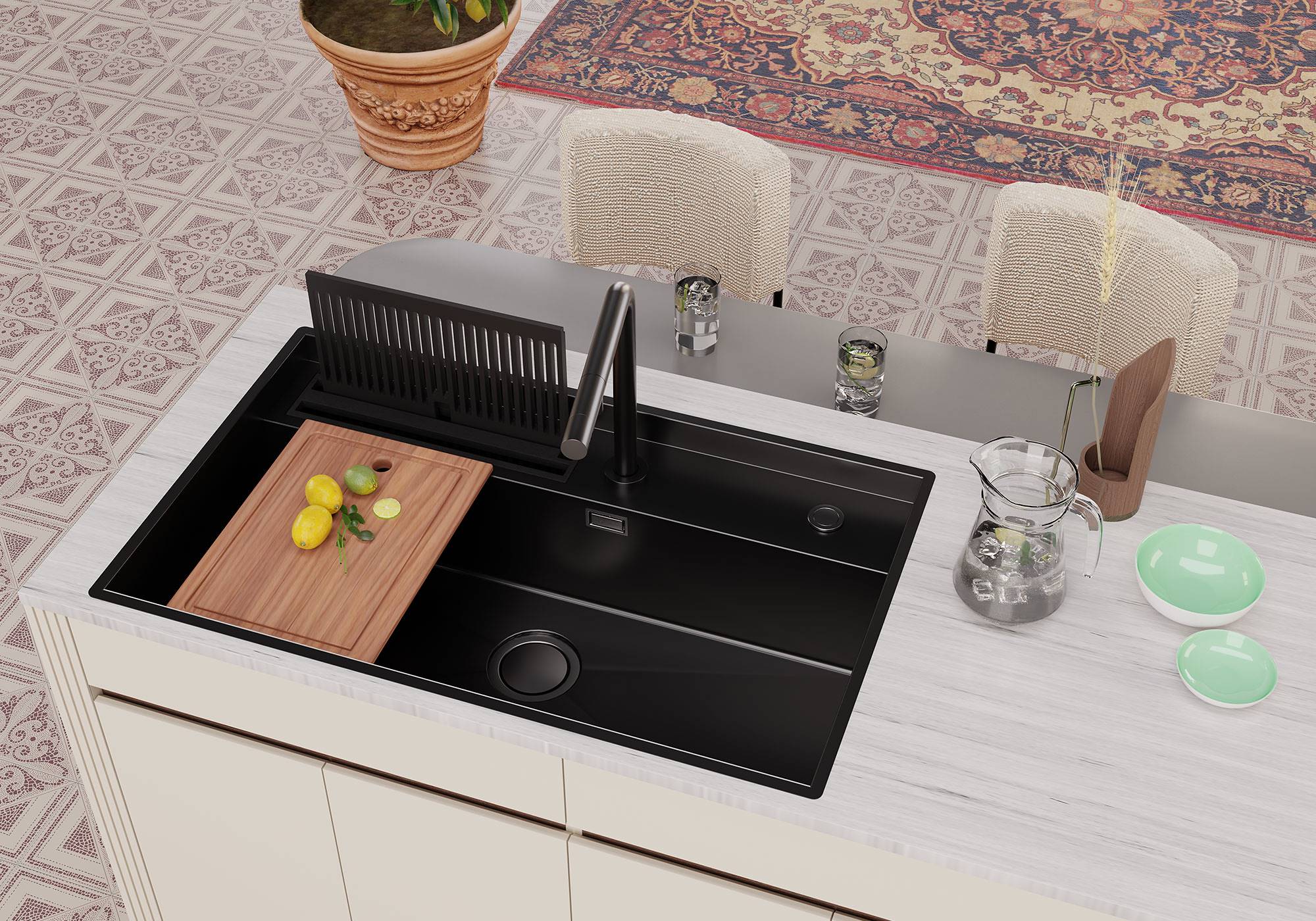 PÉRIMÈTRE TROP COMPLETLe trop plein est un dispositif de sécurité toujours présent sur les éviers Foster qui empêche l'eau de déborder de la cuve en cas d'oubli. La solution du vidange périmétrique améliore l'esthétique grâce à sa forme carrée et essentielle.