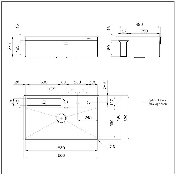 POSSIBILITÉ DE TROUS SUPPLÉMENTAIRESL'évier peut être personnalisé avec l'exécution sur demande lors de la commande de trous supplémentaires, qui peuvent être utilisés pour les mitigeurs à double trou, pour les vidanges avec télécommande ou pour l'installation de distributeurs de savon. Les positions sont marquées sur les dessins par... des trous en pointillés.