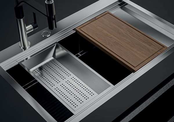 Foster Milano a une conception ingénieuse, avec un système de trois bords où les accessoires sont logés sur des niveaux séparés. Sur le premier, les grilles noires innovantes glissent, une grande surface pratique pour se rincer, s'égoutter, travailler. Le deuxième bord est conçu pour supporter et...et faire coulisser une combinaison complète d'accessoires qui rendent chaque opération sûre et pratique : rincer, vider, trancher, râper... toujours à l'intérieur de l'évier. Le troisième bord se trouve au fond de la cuve. C'est là que se trouvent les grilles Black, qui permettent de rincer les aliments sans entrer en contact avec la saleté, ou de placer les casseroles et les poêles sans les rayer. Les nouvelles grilles Black caractérisent fortement l'esthétique et la fonctionnalité. Hygiéniques, d'une grande légèreté, résistantes et faciles à nettoyer, elles sont aussi 100% écologiques, un choix qui respecte la nature et l'environnement qui nous entoure.