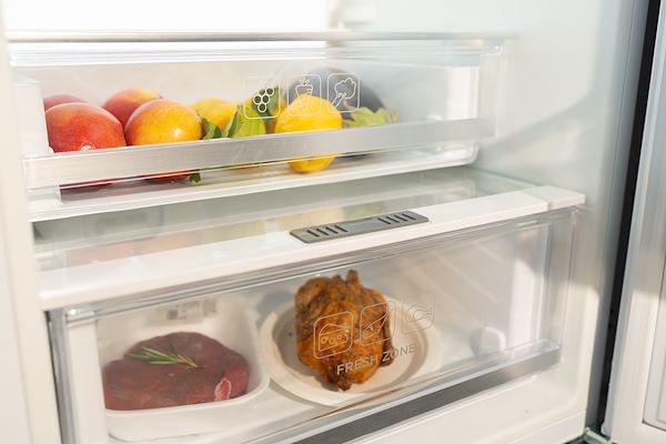 Le tiroir spécial "Cool Zone" permet une conservation idéale des aliments frais, augmentant considérablement leur durée de vie. La ventilation du compartiment réfrigérateur est directement canalisée dans le tiroir, qui maintient une température inférieure à celle réglée pour le réfrigérateur.