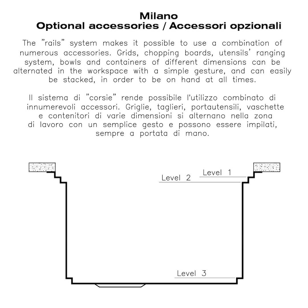 Foster Milano ha un ingegnoso design, con un sistema di tre invasi dove gli accessori alloggiano su livelli distinti. Sul primo, scorrono le innovative griglie Black, una grande e pratica superficie per risciacquare, scolare, lavorare. Il secondo invaso è studiato per sostenere e far scorrere una...a combinazione completa di accessori che rendono sicura e pratica ogni operazione: risciacquare, scolare, affettare, grattugiare… sempre all’interno del lavello. Il terzo invaso è sul fondo della vasca. Su questo trovano alloggio le griglie Black per risciacquare i cibi senza che vengano a contatto con il fondo eventualmente sporco, o per appoggiare pentole senza graffiare. Le nuove griglie Black caratterizzano fortemente l’estetica e la funzionalità. Igieniche, dotate di grande leggerezza, resistenza e facilità nelle operazioni di pulizia, sono inoltre ecologiche al 100%, una scelta rispettosa per la natura e l’ambiente che ci circonda.