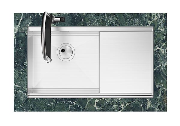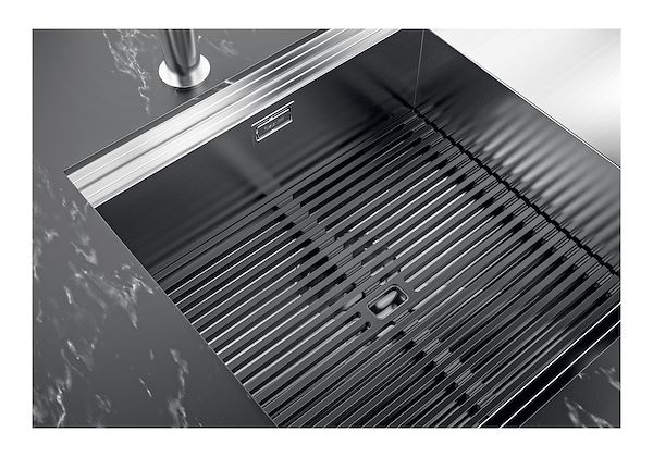 Il terzo invaso è sul fondo della vasca. Su questo trovano alloggio le griglie Black per risciacquare i cibi senza che vengano a contatto con il fondo eventualmente sporco, o per appoggiare pentole senza graffiare.