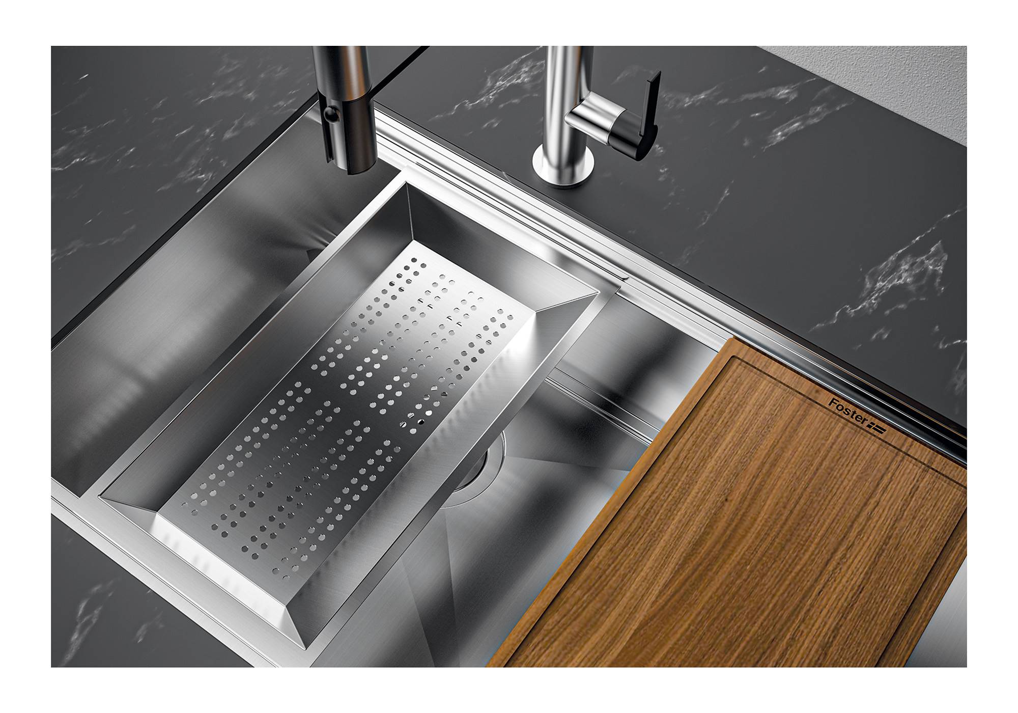 Foster Milano ha un ingegnoso design, con un sistema di tre invasi dove gli accessori alloggiano su livelli distinti. Sul primo, scorrono le innovative griglie Black, una grande e pratica superficie per risciacquare, scolare, lavorare. Il secondo invaso è studiato per sostenere e far scorrere una...a combinazione completa di accessori che rendono sicura e pratica ogni operazione: risciacquare, scolare, affettare, grattugiare… sempre all’interno del lavello. Il terzo invaso è sul fondo della vasca. Su questo trovano alloggio le griglie Black per risciacquare i cibi senza che vengano a contatto con il fondo eventualmente sporco, o per appoggiare pentole senza graffiare. Le nuove griglie Black caratterizzano fortemente l’estetica e la funzionalità. Igieniche, dotate di grande leggerezza, resistenza e facilità nelle operazioni di pulizia, sono inoltre ecologiche al 100%, una scelta rispettosa per la natura e l’ambiente che ci circonda.