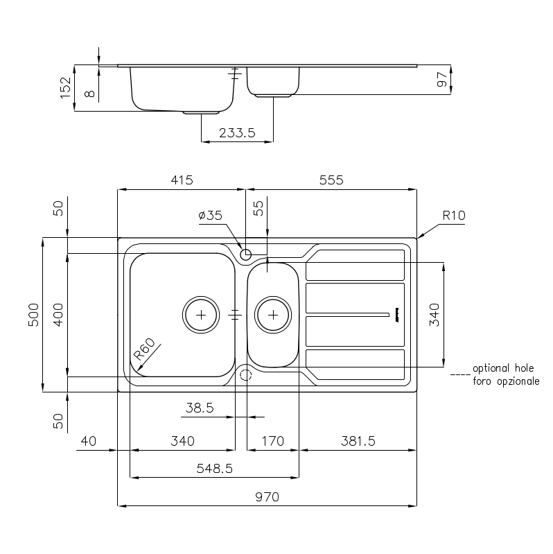 Il lavello è personalizzabile con l’esecuzione su richiesta in fase d’ordine di fori aggiuntivi, utilizzabili per miscelatori a doppio foro, per pilette con comando remoto o per l’installazione di dispenser per il sapone. Le posizioni sono segnalate sui disegni con fori a linea tratteggiata.