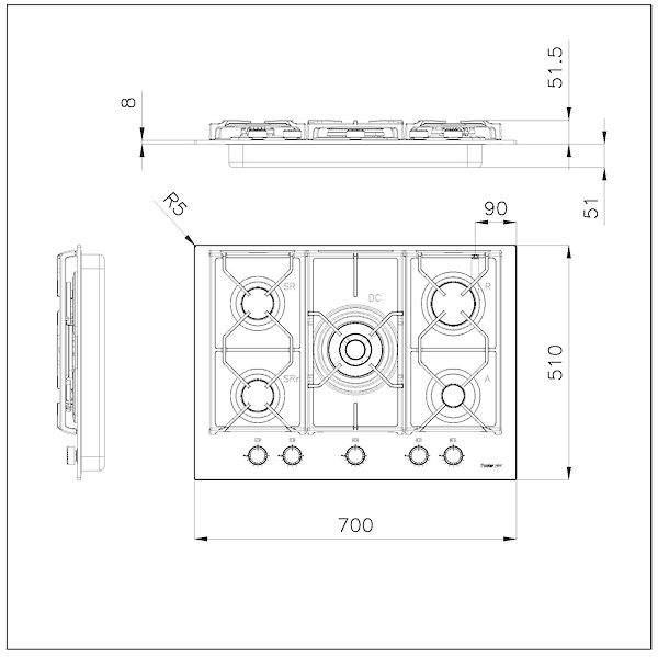 FORO INCASSO STRETTOQueste versioni da incasso standard a 5 fuochi necessitano di un foro incasso di soli 56 cm, inferiore alla loro larghezza nominale . Questo li rende interessanti alternative ai modelli 60 cm che presentano generalmente lo stesso foro.