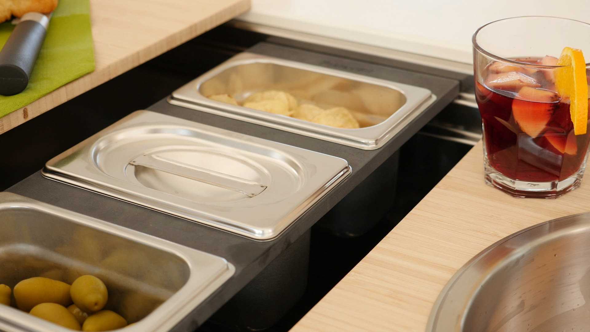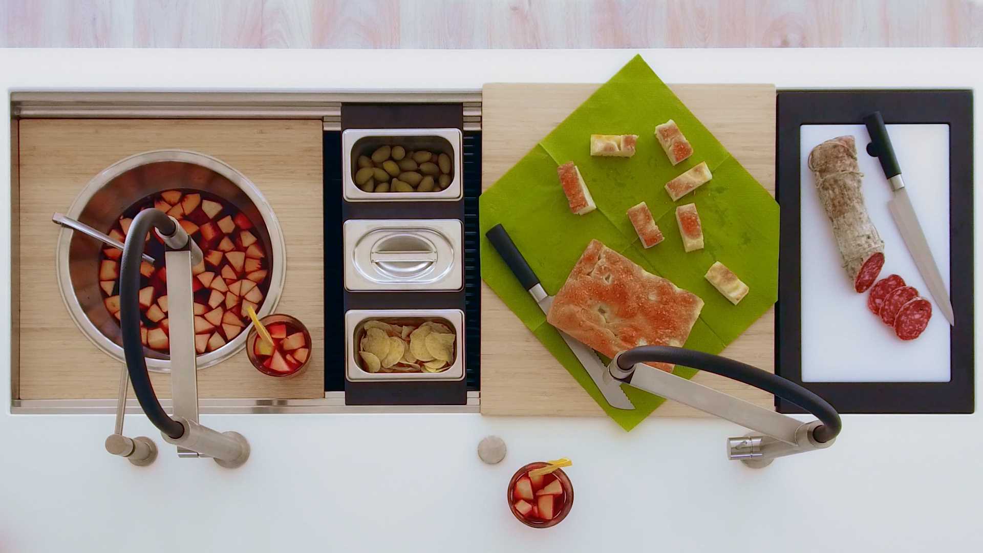 Il centro funzionale Happyhour Sposta la definizione di lavello verso nuovi orizzonti. Grazie al suo vasto corredo di accessori è il vero protagonista della festa, dei vostri aperitivi, dei vostri buffet e assieme una pratica e completa postazione chef, capace di scomparire per poi apparire nella sua pluriaccessoriata zona lavaggio.